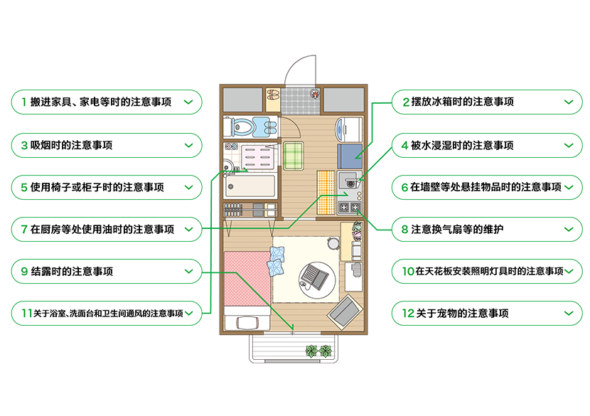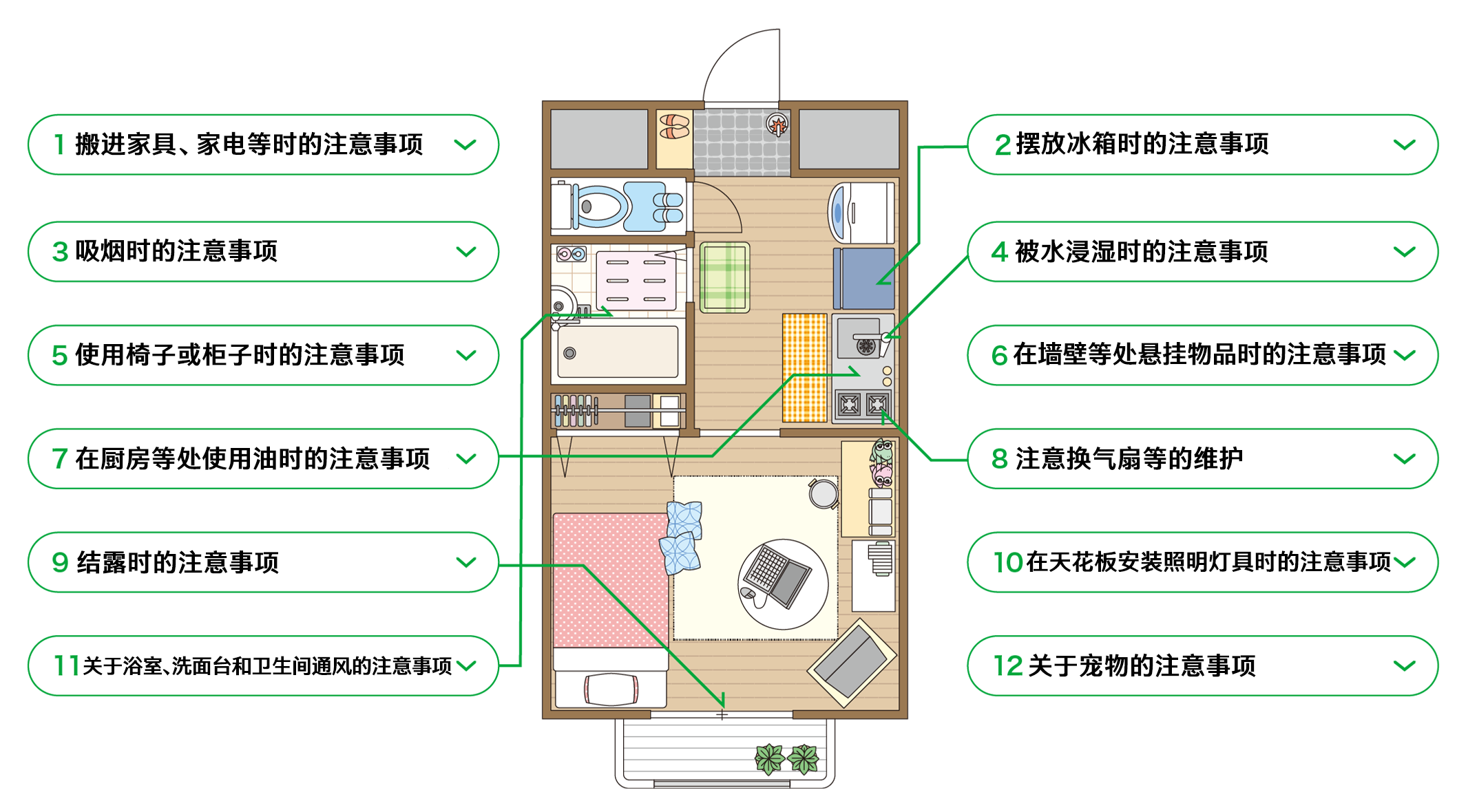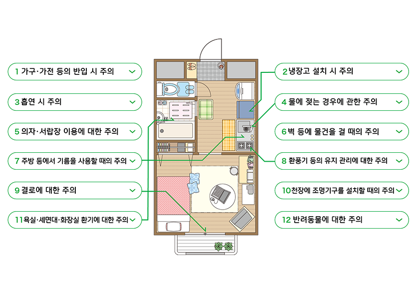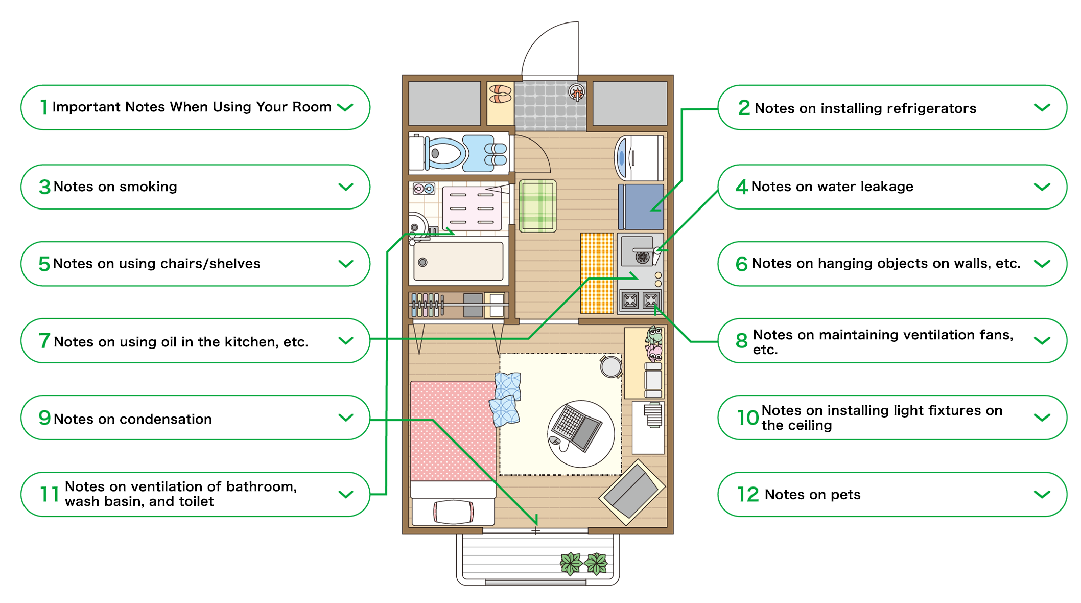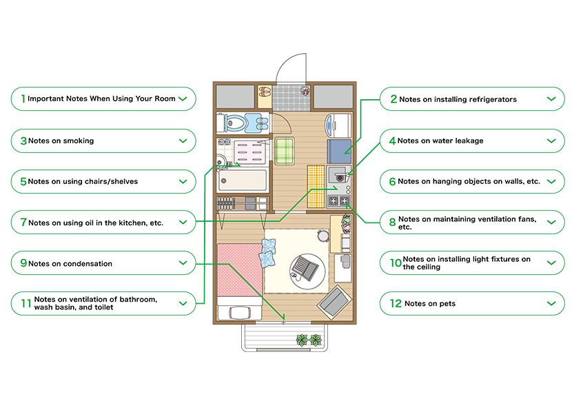 When bringing furniture, appliances, or other items into the room, please make sure not to scratch the doors, walls, flooring, tatami mats, or other surfaces by attaching protective covers to the doors and walls, placing mats over the flooring and tatami mats, and taking other precautions.