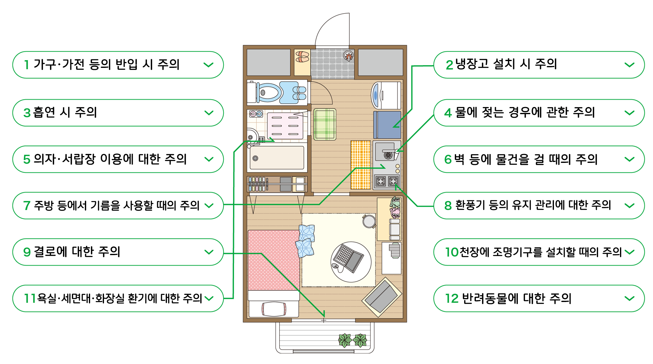 In the event of water leaking in the room, including rain entering the room, food or drinks being spilled, or water leaking from the air conditioner, make sure to wipe it up immediately. Leaving the water to sit and not wiping it up may cause stains or mold to appear in those areas. It can also cause flooring to discolor or walls to decay.